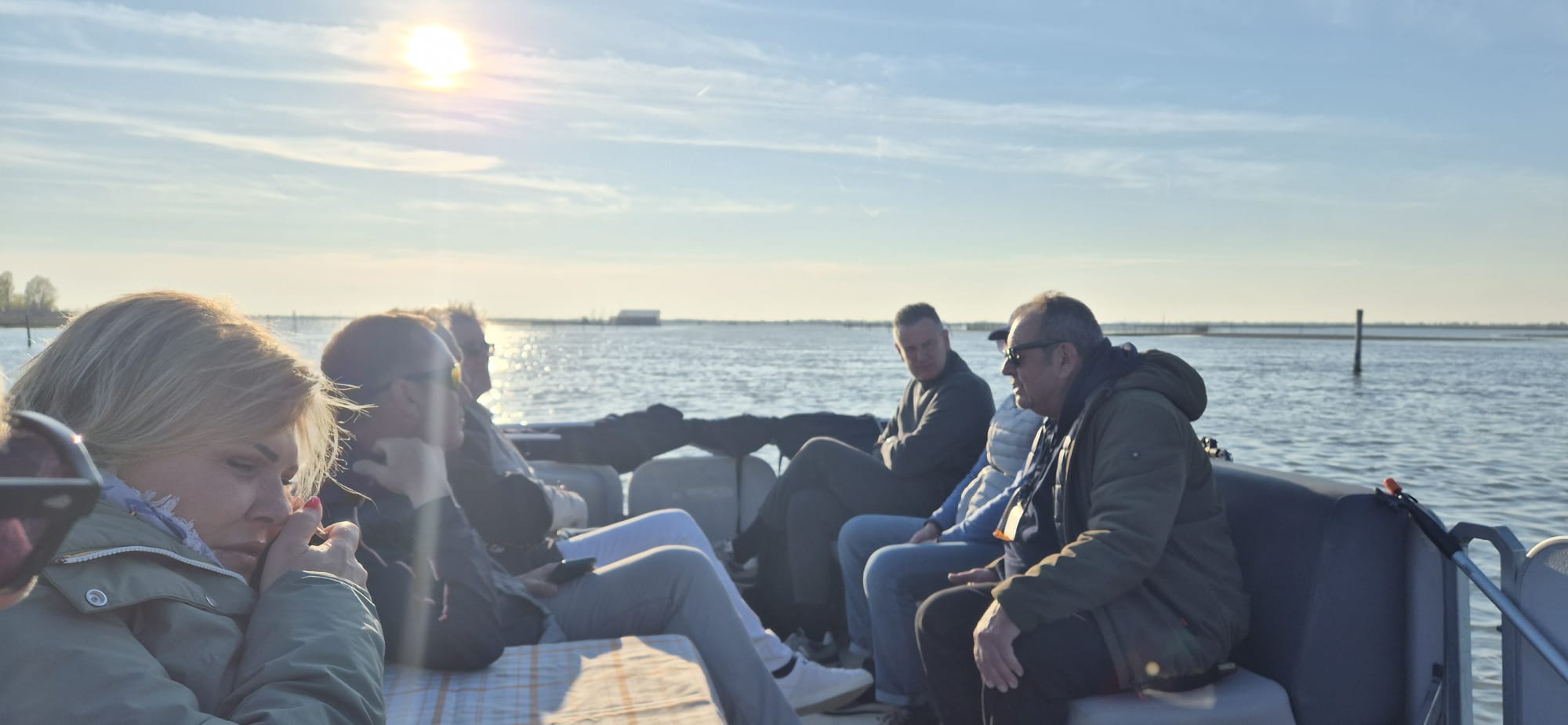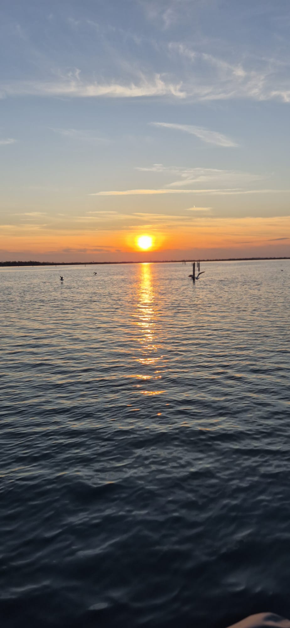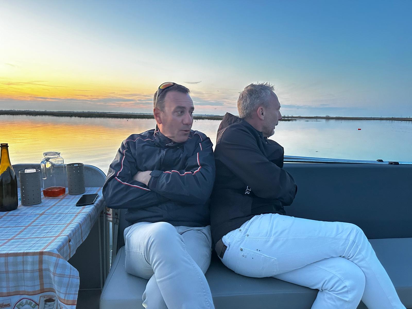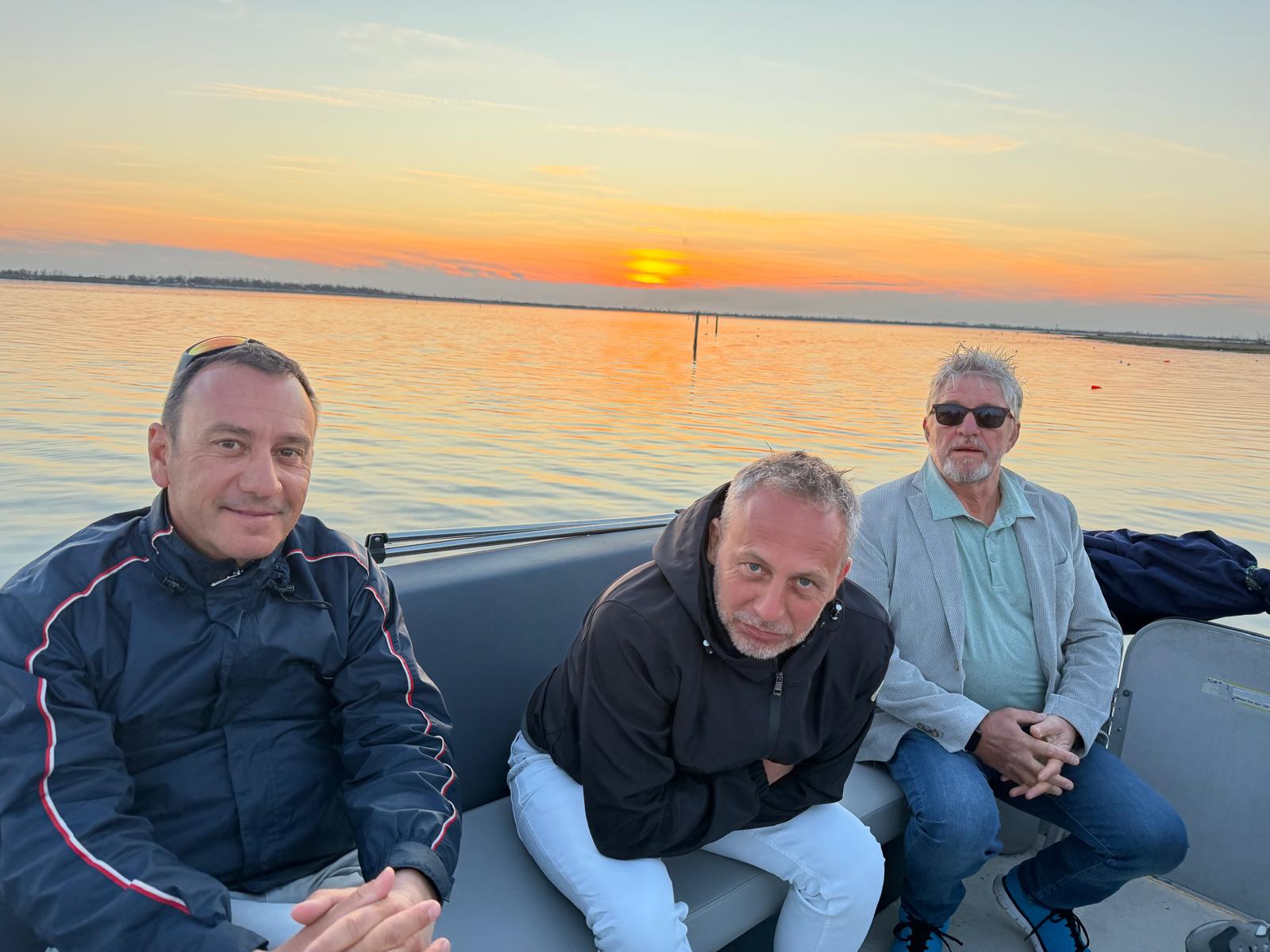 Alle cinque di sabato il gruppo si è recato al Sunset Point n° 13 per un’escursione nella laguna di Caleri, tra orti d’acqua e fenicotteri, aspettando il tramonto con un buon bicchiere di vino e cicchetti. Il Capitano/Cuoco Sig. Daniele Grossato, ci ha deliziato con ottimi cicchetti: gamberetti con polentina, cozze, formaggio e miele del territorio, il tutto accompagnato da prosecco e spritz e, per finire, i biscotti “S” rigorosamente intinti nel prosecco, mentre la Guida Naturalistica Sig. Nicola Donà, molto preparato, ha spiegato tutti i segreti della laguna, dalle maree, al fondale, alle coltivazioni di vongole negli orti, il lavoro dei pescatori, gli uccelli migratori e quelli stanziali. Un’esperienza davvero entusiasmante ed istruttiva.